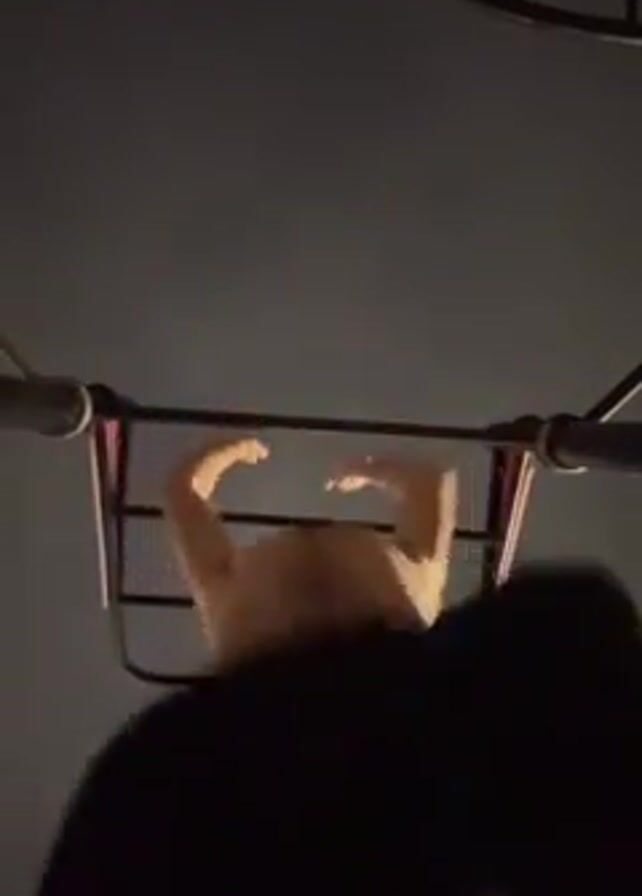 A shirtless individual in dark trousers is hanging upside down on a metal bar structure at night