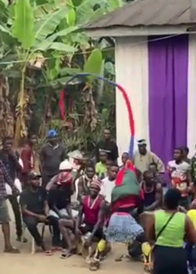 In a slightly high-angle shot, a man wearing a distinctive green and red outfit with a long, colorful ribbon-like structure is at the center of a lively scene, apparently outdoors, surrounded by a crowd of onlookers. The man is actively dancing or performing, moving dynamically in the dusty ground. The crowd consists of men and women of various ages, some seated on chairs, others standing or moving around, watching the performance with interest. They are dressed in casual clothing, reflecting a relaxed atmosphere. Behind them, there is a simple building draped with purple and white fabric, suggesting a backdrop for the event. Banana trees and other lush greenery fill the frame, giving a tropical ambiance to the environment.