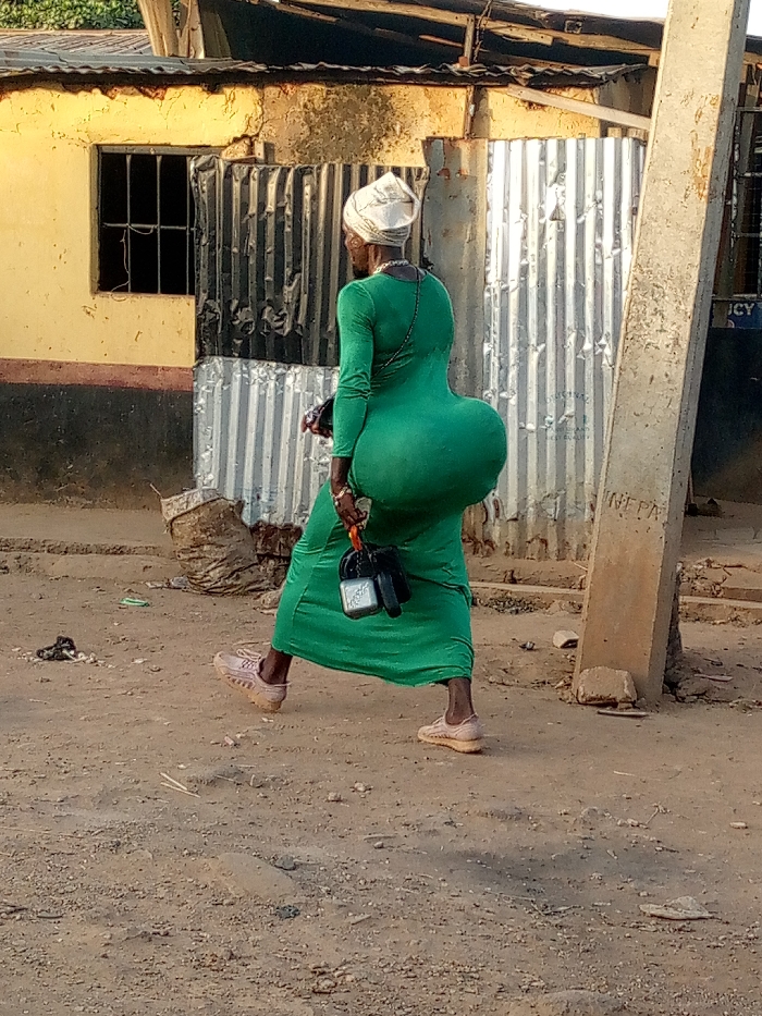 A person in a long-sleeved green dress and a white headwrap walks on a dirt road. The figure has a large, prominent backside. They carry a black bag and wear pink sneakers. The background features buildings with corrugated metal and a concrete post marked with indecipherable words. The scene appears to be an outdoor setting in a less developed area.