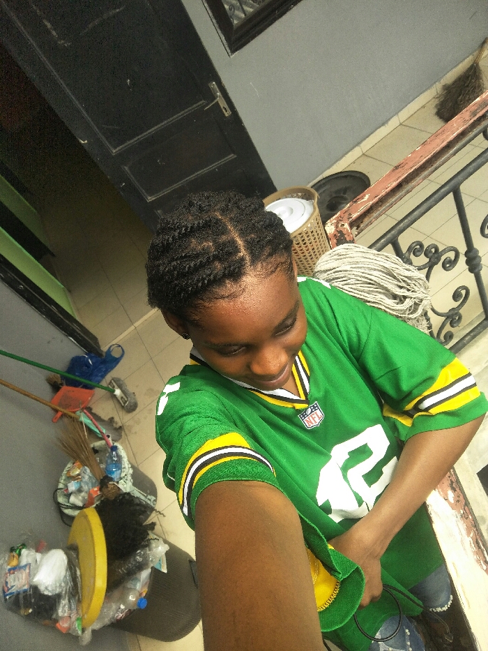 A young person with dark skin and short, twisted hair parted into sections, wearing a green American football jersey with yellow and white stripes and a visible "NFL" logo, is depicted in a selfie-style shot