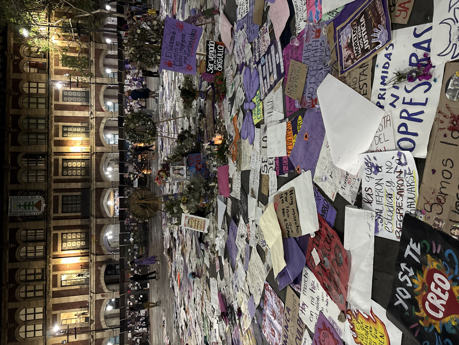 This image depicts a nighttime scene in a public plaza in Cuernavaca, Mexico, immediately in front of a colonial-style, multi-story building featuring arcades and numerous illuminated windows. The ground across the entire visible area is densely covered with thousands of handwritten signs, posters, and pieces of paper, many displaying messages in Spanish, often in shades of purple, white, and red. These signs articulate protests against femicides and demand justice, with specific mentions of "Morelos" and the government's perceived inaction. In the mid-ground, several makeshift memorials or altars are arranged. These include wreaths on tripods, central displays adorned with fresh flowers, lit votive candles, and framed photographs of women, notably one prominent portrait of a young woman. A rustic, cross-like wooden structure is also visible among these memorials. Behind these central displays, a dark barrier or fence spans the width of the plaza, beyond which additional signs and visual displays are visible. Several individuals are present in the mid-ground and background, walking or standing casually, observing the extensive display. A few figures are also discernible on the balconies of the background building. The scene collectively represents a large-scale public memorial and protest against gender-based violence and femicides.