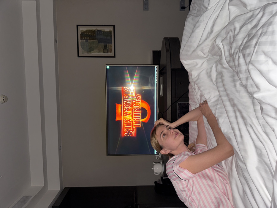 A woman in pink and white striped pajamas lies in a white bed, looking up at a television screen displaying the "Stranger Things" logo