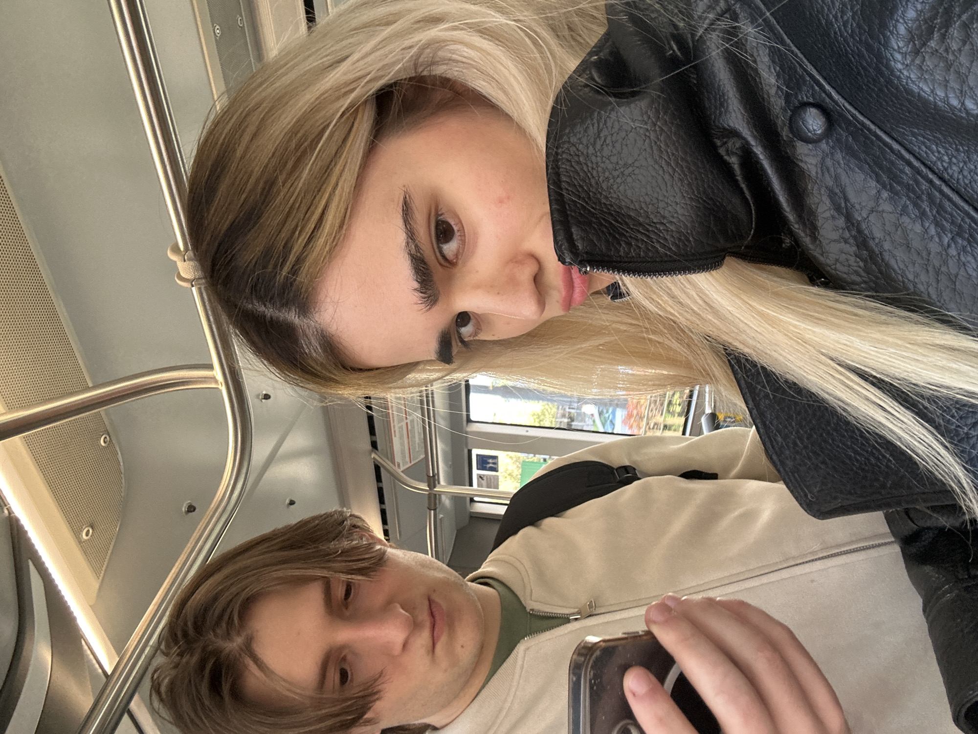 The image depicts two individuals inside a public transport vehicle, likely a tram or metro train, in Milan, Italy. In the foreground on the right, a female subject with long, light blonde hair and visible darker roots wears a black leather jacket with a zippered high collar. She looks directly at the camera with a slightly pouted expression. Behind her and to the left, a male subject with medium-length light brown hair styled with a center part and bangs is observed looking down at a dark-colored smartphone held in his left hand. He is wearing a light beige or cream-colored zippered jacket over a green shirt, with a black backpack strap visible over his right shoulder. The vehicle's interior features a light-colored ceiling with embedded linear lighting and perforated ventilation panels, along with silver metallic overhead grab bars running horizontally. Through the windows in the background, urban scenery including trees with visible autumn foliage can be seen.