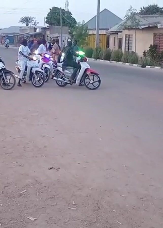 street scene with several people riding motorcycles. The motorcycles are mostly white with some colored accents. The riders are all wearing clothing, some in traditional attire. They appear to be traveling together on the road. The road is paved but the shoulders are dirt. The background shows residential buildings and other structures. The sky is overcast.