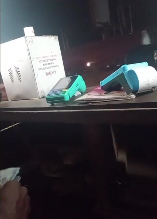 countertop at night with payment devices, including a green card reader, a blue and white printer, and a yellow device. A hand counts money, puts it on the counter, and then holds a phone. The counter is cluttered with papers, and a box of thermal paper rolls is visible. The background shows a street scene with vehicles and people, indicating an outdoor setting. Noise is heard from the street.