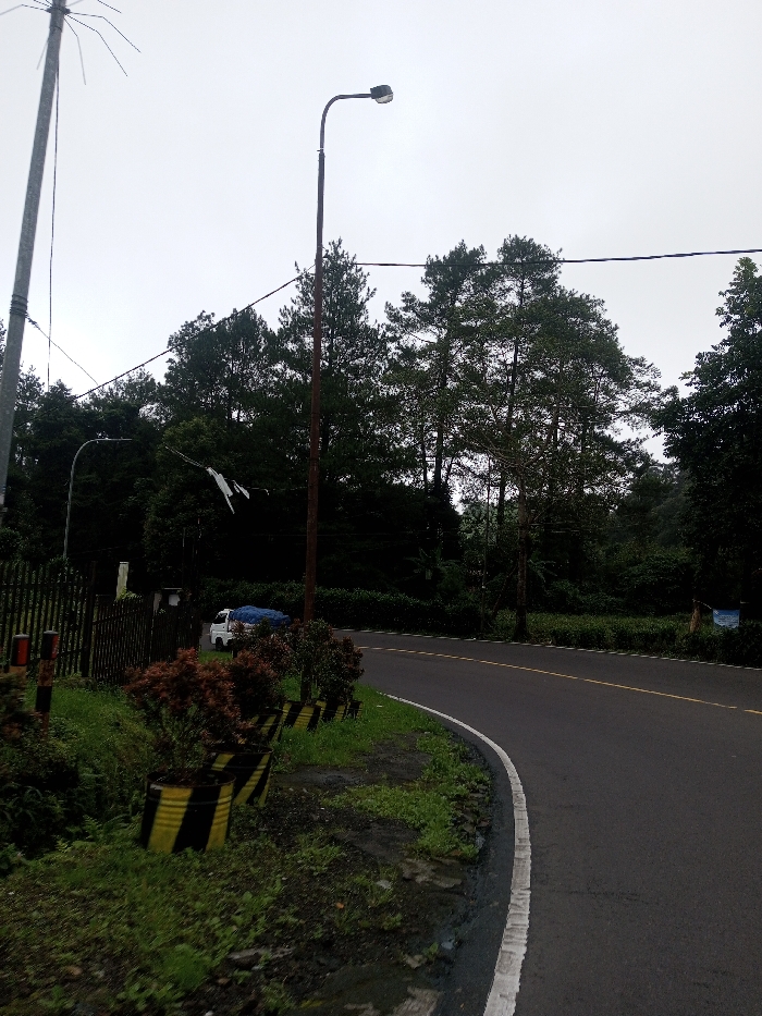 The scene is set in Deothang, Bhutan. The image depicts a curving asphalt road under an overcast sky. The road features a solid white line marking its outer edge and a faded yellow double line in the center. To the left of the road, a strip of green grass and dirt contains three cylindrical planters, painted with alternating yellow and black stripes, holding small reddish-brown shrubs. Behind these, a black metal fence is partially visible, with a faded red and black striped pole. Further left, a tall, slender gray utility pole with an antenna array or complex wiring at its top stands. Near the road's curve, a tall, rusty brown street lamp pole with a single luminaire is positioned. Horizontal wires are strung between utility poles and across the frame. Dense green foliage, predominantly conifer trees, lines both sides of the road and forms a thick backdrop. A small white utility truck with its bed covered by a blue tarp is parked on the left, partially obscured by the fence and vegetation. A small blue sign is faintly visible against the dark trees on the right side of the road further down the curve. No individuals are present in the scene.