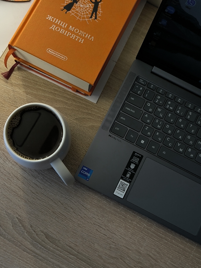 This image displays an overhead, slightly angled view of a workspace in Vinnytsia, Ukraine. The primary surface is a light-colored wooden desk. In the upper left quadrant, a hardbound book with an orange cover rests on a white sheet of paper. The book's cover features a white illustration of two stylized figures connected by a spiderweb, along with white Ukrainian text reading "ЖІНЦІ МОЖНА ДОВІРЯТИ" (A Woman Can Be Trusted). A red fabric bookmark is visible extending from the book's spine. To the right of the book, in the upper right quadrant, a dark grey laptop is partially open with its screen dark. The keyboard features both Cyrillic and Latin characters. The laptop's palm rest displays an "Intel Core i7" sticker, a "Dolby Audio" logo, and a black sticker with a QR code and additional text. In the lower left quadrant, a white ceramic mug filled with a dark liquid, presumably coffee, exhibiting small bubbles on its surface, is positioned on the wooden surface. No individuals are present in the scene, and no active interactions are depicted.