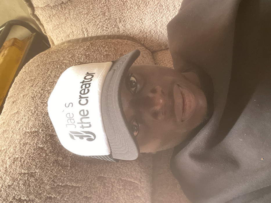 An individual is depicted in a close-up, head-and-shoulders portrait shot, likely a selfie. The person, appearing to be a young male with a dark skin tone, looks directly into the camera with a neutral expression and slightly parted lips. He is wearing a black crew-neck garment, possibly a t-shirt or sweatshirt. A white and black trucker hat is worn, with the white front panel displaying the text "Jae's the creator" in black sans-serif font, with the 'J' styled decoratively. The background consists of a textured, plush, light brown or beige upholstered surface, consistent with a sofa or recliner. Soft, warm lighting illuminates the scene. The specific location within the city of Jos, Nigeria, cannot be determined from the visual information provided in the image.
