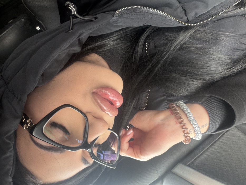 The image displays a close-up, angled view of a female individual from approximately the nose to the mid-forearm, positioned within the interior of what appears to be a vehicle. Her eyes are closed or heavily downcast, and her full lips are prominently pursed or pouted, coated with a glossy, light red or pink-tinted product. She wears black-framed, cat-eye style eyeglasses featuring gold-colored decorative elements on the temples; reflections are visible on the lenses. Dark, straight hair is visible on the right side of the frame. She is dressed in a black hooded jacket or coat, which shows a prominent zipper on the front and a drawstring detail on the hood. A black garment is visible beneath the jacket. Her left hand is positioned near her chest, displaying light-colored fingernail polish. Two coiled bracelets, one silver-colored and one reddish-brown, are worn on her left wrist, partially obscuring a faint marking or tattoo. The immediate background indicates a vehicle interior, likely a seat and door panel. No identifiable landmarks or specific environmental details are present in the image to determine a location in Sofia, Bulgaria, or any other specific city or country.