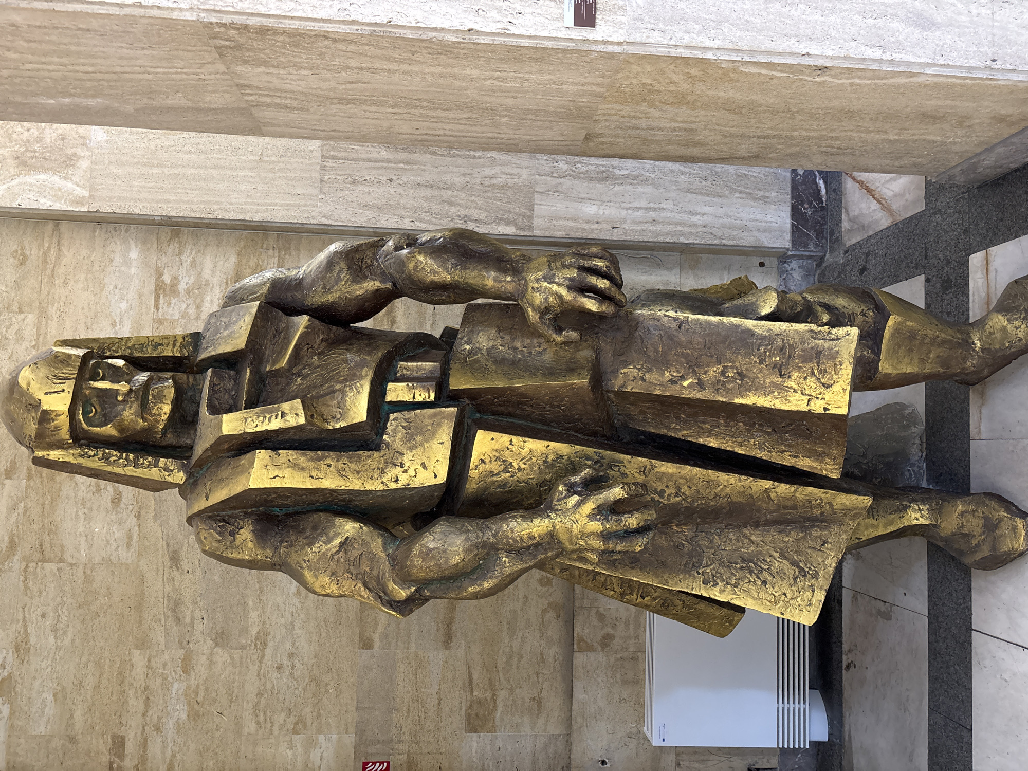 A bronze sculpture is presented in a vertically oriented indoor setting, likely within a public building. The sculpture depicts a human figure rendered in a cubist style. Its features are fragmented and angular, with the head, torso, and limbs composed of geometric shapes. The statue is installed on the second floor of an edifice with light-colored marble-patterned walls, and a ceiling with similar marble paneling. Visible in the background are marble columns and adjacent, a white radiator under the left portion of the sculpture. This is a depiction of "The Man" monument in Veliko Tarnovo, Bulgaria.