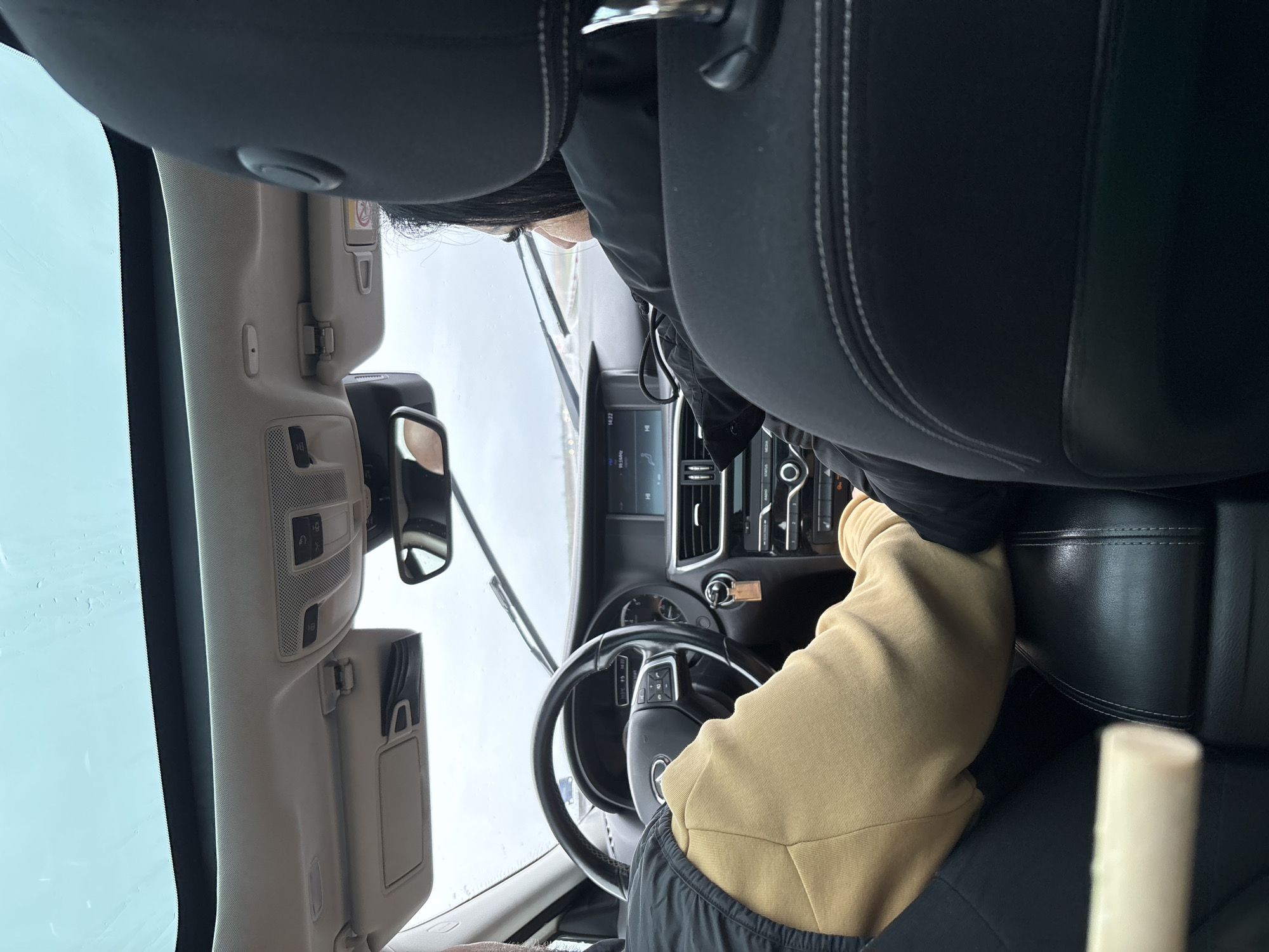 The image depicts the interior of a vehicle, likely a car, during a rainy day