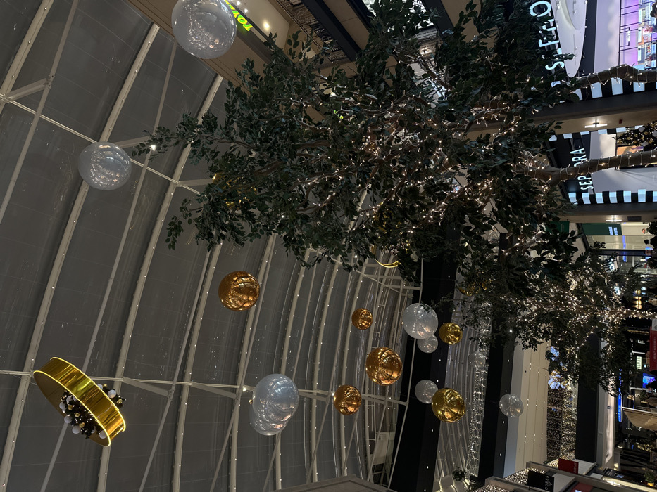 A high-angle shot reveals an indoor space decorated with trees adorned with tiny lights, interspersed with silver and gold spheres. Architectural elements feature a curved, gray ceiling with vertical lines, hinting at a large, airy structure, possibly a mall. Retail signage is visible in the distance, including "SEPHORA," indicating the setting. The overall scene evokes a festive or decorative atmosphere.