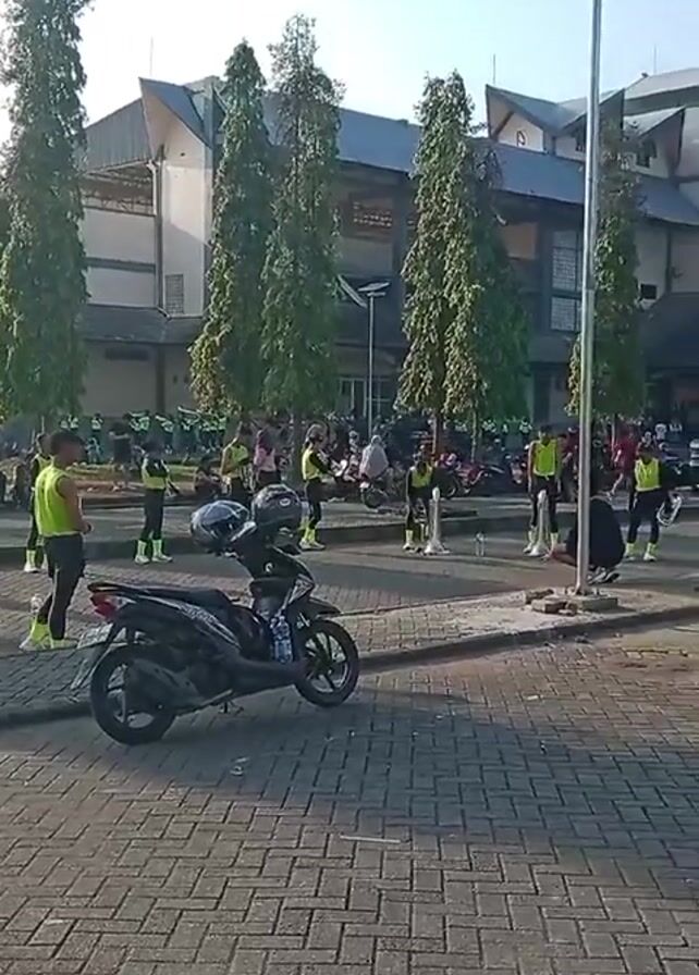 group of people wearing neon yellow vests and dark pants standing in a paved open area, with trees and a large building in the background. Some of them are performing stretching exercises. Several motorcycles are parked nearby. The sky is clear and bright. The pavement appears to be made of interlocking bricks. The video is taken from a stationary position. The overall scene suggests an organized group activity or training session taking place outdoors.