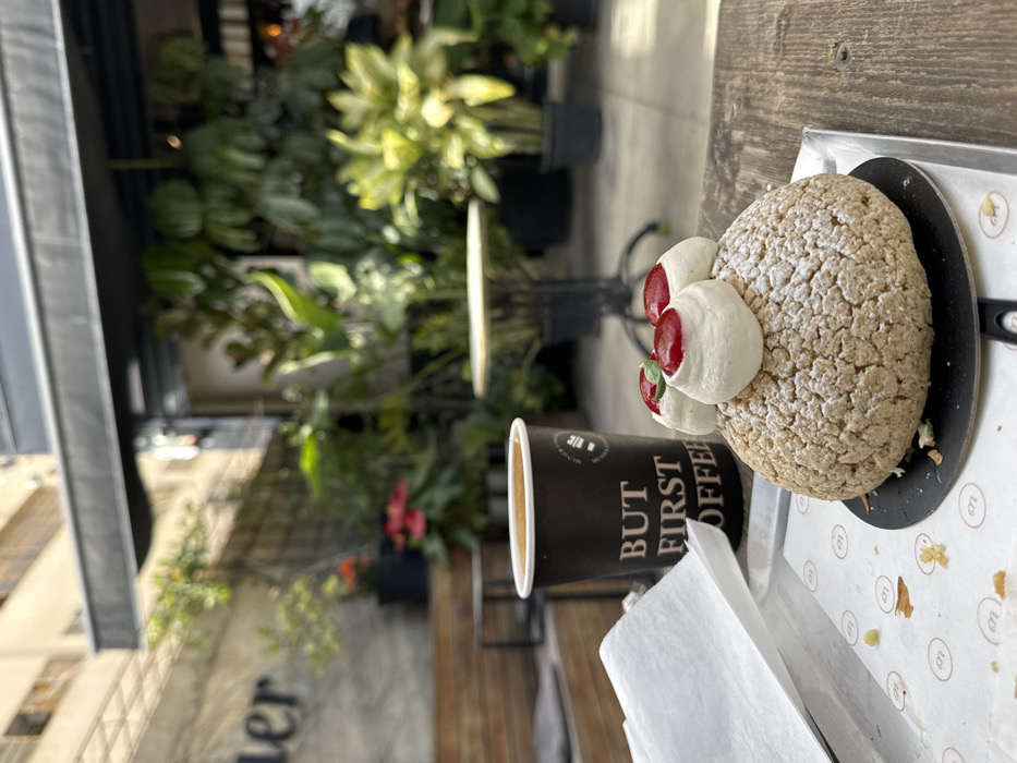 The image displays a close-up of a single serving of coffee and a pastry situated on a wooden table within an outdoor cafe environment in Bat Yam, Israel. A black disposable coffee cup, bearing the white text "BUT FIRST COFFEE" and a circular logo, holds a dark liquid. To its right, a large, round pastry with a textured, light brown surface, dusted with powdered sugar, is presented. This pastry is topped with three dollops of white cream, each adorned with a red, glossy fruit preserve; one cream dollop also includes a small green leaf. The pastry rests on a small black circular base, which sits on a white paper liner patterned with a repeating "m"-like logo, all placed on a silver rectangular tray. Scattered crumbs are visible on the paper liner. The background reveals a blurred outdoor cafe patio featuring numerous potted green plants and shrubs, a small round table with a dark metal base, a concrete wall, and a dark awning extending from an adjacent building. Distant, blurred urban architecture is visible under natural daylight.