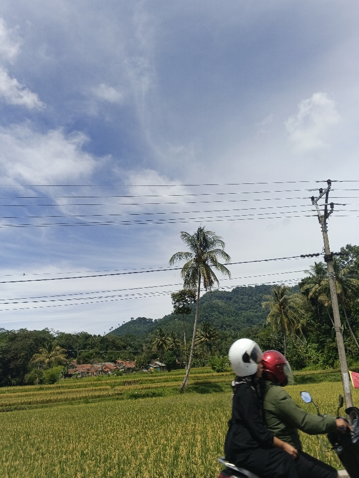 A landscape shot shows a rice field under a blue sky with scattered clouds. A coconut tree stands tall amidst the field. In the background, a mountain rises, covered in lush greenery, with a small village nestled at its base. Power lines stretch across the sky. A couple on a motorcycle, wearing helmets, are in the foreground. They are positioned to the right of the frame, with the rider wearing a green shirt and the passenger in black.