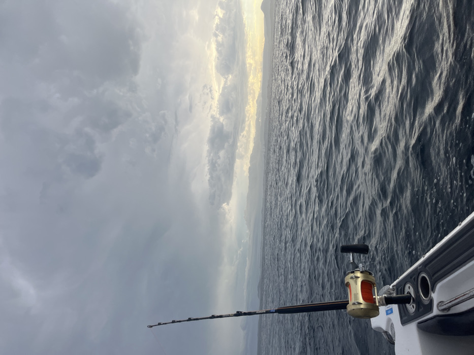 The image depicts a fishing rod extending from a boat towards the sea. The ocean, covered in ripples, stretches toward a distant shoreline under a sky filled with dark, brooding clouds. A sliver of sunlight breaks through the clouds, casting a faint glow on the water and the distant land. The fishing rod, held firmly in a boat-mounted holder, suggests anticipation. The overall atmosphere is one of maritime activity under overcast conditions.