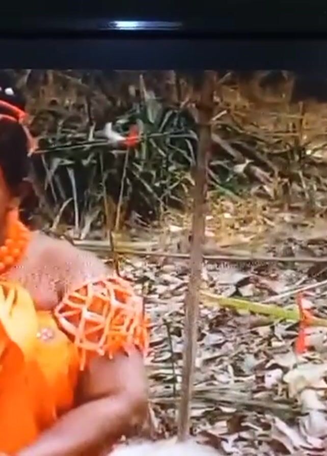 woman in a forest. The woman is wearing a black head covering, a patterned shawl, and necklaces. She has red and white paint on her face and arm. She is sitting in front of a dense background of trees and foliage. In the background, there are a few items hanging from branches. The video also shows another woman walking past a thin fence. She is wearing a short, light-colored plaid dress. The scene appears to be from a television show, as there is a network logo and channel number visible in the corner of the screen.