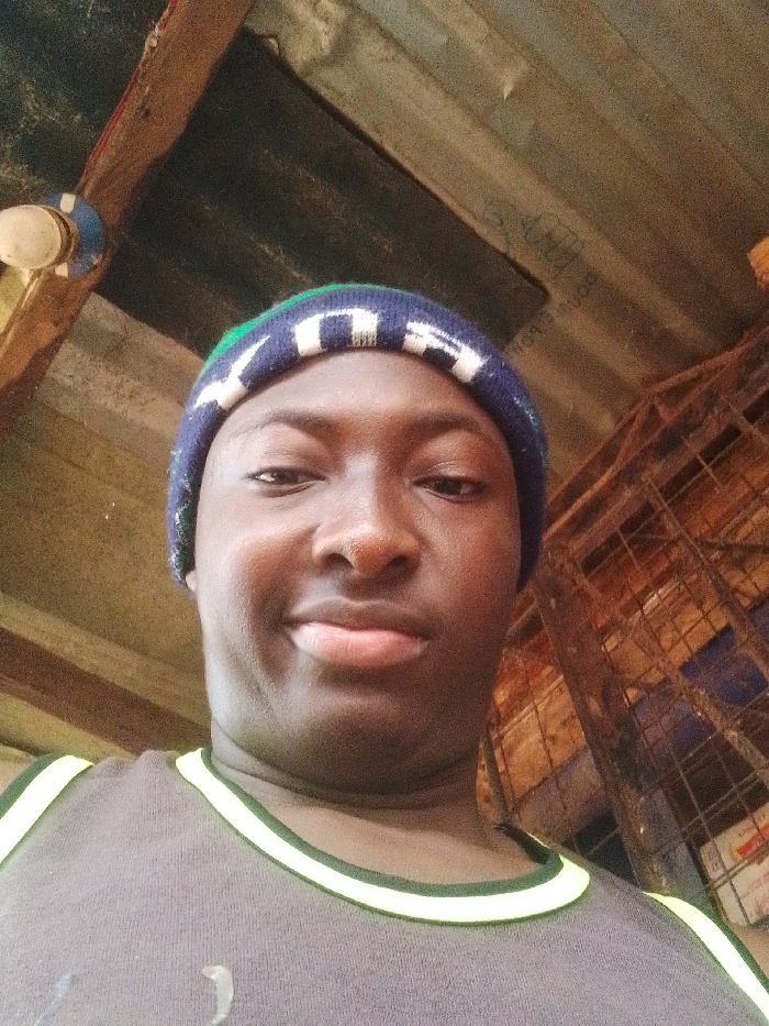 A selfie captures a dark-skinned person with a blue, white, and green beanie. The individual wears a gray shirt with a neon green trim, and is looking directly at the camera. The background is cluttered. A light fixture is on the left, and corrugated metal sheets make up the ceiling. To the right, there is an obscured wire cage.