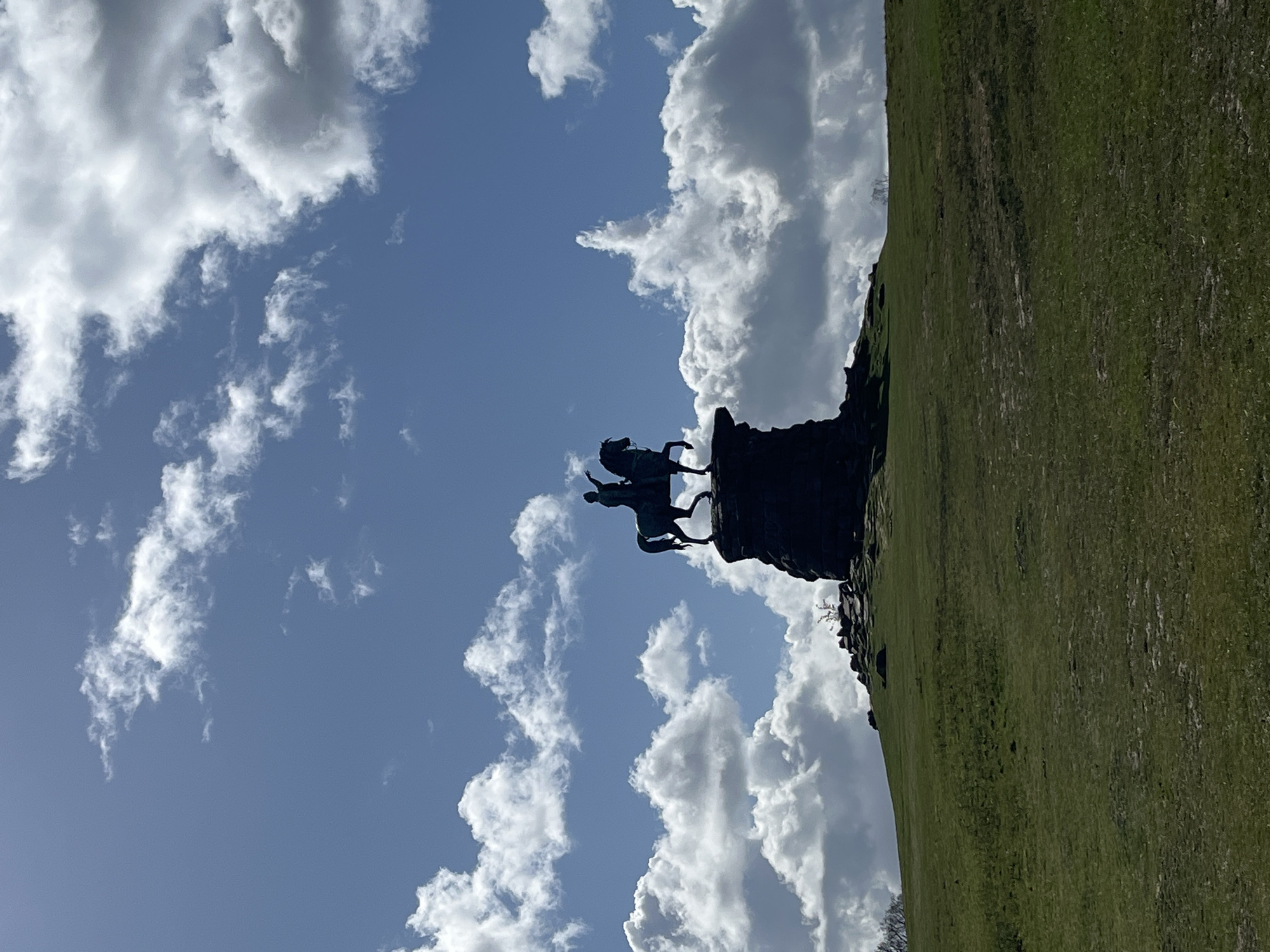 - "The image presents a silhouetted equestrian statue situated atop a grassy hill under a blue sky populated with white cumulus clouds, located in The Village, United Kingdom" by FM-Z8FlC3, licensed under CC BY 4.0