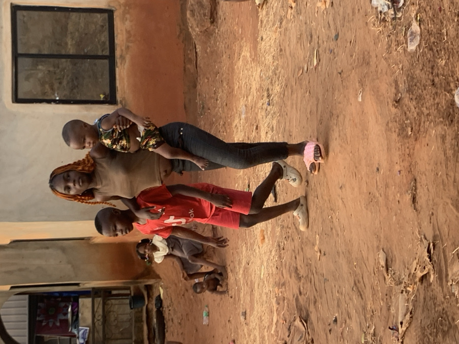 A woman with orange braids carries a young child on her back, walking alongside a boy in a red shirt and shorts. Other children are behind the boy, one wearing a face mask. They are on a dirt ground near a building with a window. The ground has scattered debris.