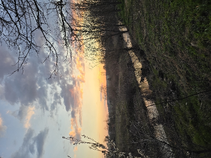 The image depicts an outdoor environment at sunset in the vicinity of Vojnik, North Macedonia. The upper frame shows a sky with scattered clouds displaying orange, pink, blue, and grey coloration. A low sun is discernible on the horizon, manifesting as an intense orange luminescence, partially obscured by distant land features. A narrow, dark body of water, consistent with a stream or canal, extends from the mid-left towards the mid-right, reflecting the orange light from the sky. The immediate banks of this waterway are covered by dense, dark, leafless deciduous trees and bushes. To the right of the water, a grassy embankment slopes upwards and extends into the right foreground. Bare tree branches, indicative of deciduous trees in an dormant state, are present in the foreground, framing the upper and left periphery of the scene. No persons or distinct man-made structures are observed.