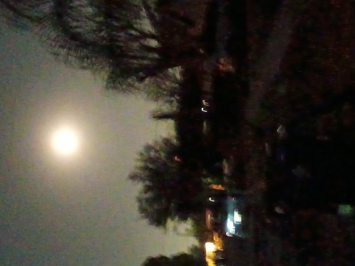The image depicts a blurry, low-light outdoor scene at night within a residential or suburban area of Los Angeles, United States of America. A prominent, bright, circular celestial object, consistent with the moon, is visible in the upper center against a hazy sky. Silhouetted trees and dense foliage define the middle ground and right side. In the mid-left portion of the frame, a vehicle is present with its headlights illuminated, appearing stationary or slowly moving. Additional diffused artificial light sources, likely from distant buildings or streetlights, are scattered across the background and mid-ground. Two distinct, curved light sources resembling a 'J' are visible in the mid-right. The foreground is dark and indistinct. No individuals or specific actions are identifiable within the frame. The image exhibits significant blur and lack of focus, indicative of low-light photography conditions or camera movement.