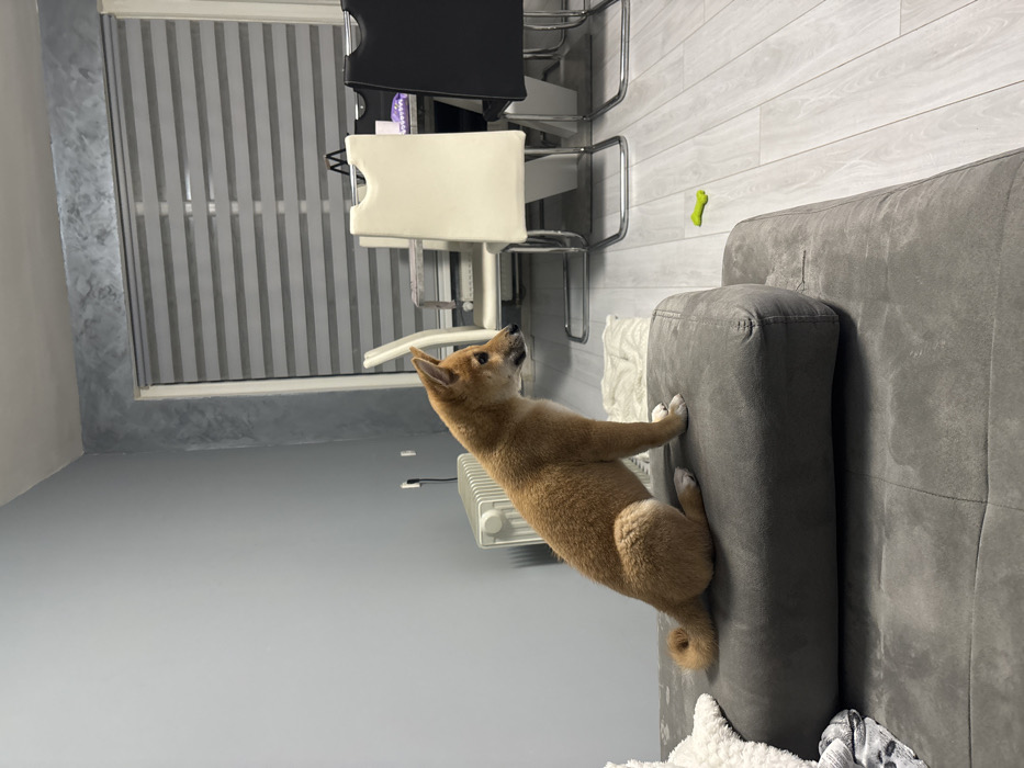 The scene depicts a residential interior in Pernik, Bulgaria. A light brown and white Shiba Inu dog is seated centrally on a dark grey, upholstered sofa, facing right with its head turned slightly forward. Its tail is curled over its back. To the left of the dog, a white, textured fabric is partially visible on the sofa. In the midground, a white panel radiator is mounted on a plain light blue-grey wall. Beyond the dog and radiator, a large window is fitted with grey horizontal blinds. Below the window, a dining area is visible, featuring a table with a metal base and three modern chairs (one white, two black) with chrome frames. The floor throughout the visible area is light-colored laminate flooring. A small, light green, bone-shaped dog toy lies on the floor near the dining chairs. The wall segment directly above the window frame displays a grey, textured finish. No human subjects are present in the image.