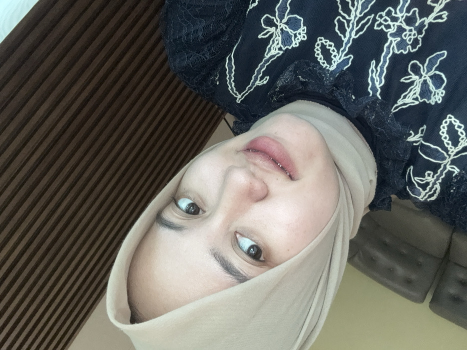 A woman wearing a hijab and floral-patterned top takes a selfie. Her skin is fair and eyes are brown. She has braces on her teeth. A brown, horizontally-paneled wall is to her left. The top of a tufted brown couch is visible in the bottom right corner. The picture is taken at an unusual angle.