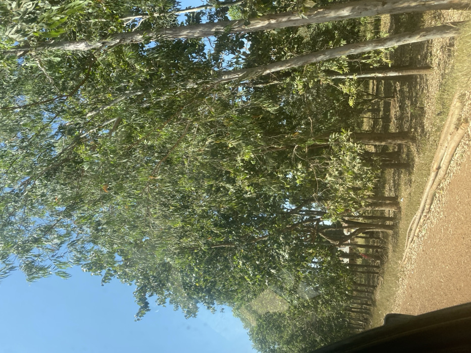The scene in Wang, Nigeria, depicts a verdant, semi-forested roadside environment under a clear, bright blue sky. A prominent row of mature trees with varied foliage dominates the image, featuring slender trunks and light bark on some trees, and denser, darker green leaves on others, suggesting a mix of species. The ground beneath the trees is covered with dry grass and sparse vegetation. In the foreground, a reddish-brown dirt path or unpaved road runs parallel to the tree line. Along the immediate edge of this path, approximately five light-colored, cylindrical logs or debarked tree branches are laid horizontally. In the mid-background, partially obscured by the trees, a light-colored building structure is faintly visible. No individuals, animals, or discernible actions are present. The image appears to be captured from inside a vehicle, indicated by a dark structural element in the lower left corner.