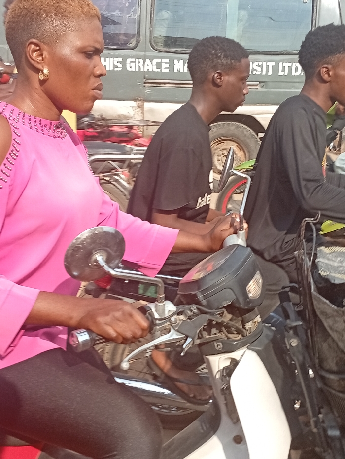 A frontal-left perspective captures an urban street scene in Nnewi, Nigeria, primarily featuring a woman and two men on motorcycles or scooters amidst other vehicles. The central figure is a woman positioned on a white and black scooter, her left hand gripping the handlebar. She wears a pink top with beaded cold-shoulder accents and black leggings. Her hair is short and light brown, and she has a gold earring on her visible left ear. Her facial expression is neutral, looking forward. Behind her, two young men, both wearing black t-shirts and with short dark hair, are also seated on motorcycles, facing the same direction. In the background, a dark green bus or large vehicle is visible, bearing the partially legible inscription "HIS GRACE M..." and "VISIT LTD" on its side, along with a visible tire and windows. The arrangement of individuals and vehicles suggests a traffic flow or a stop in a busy street environment.