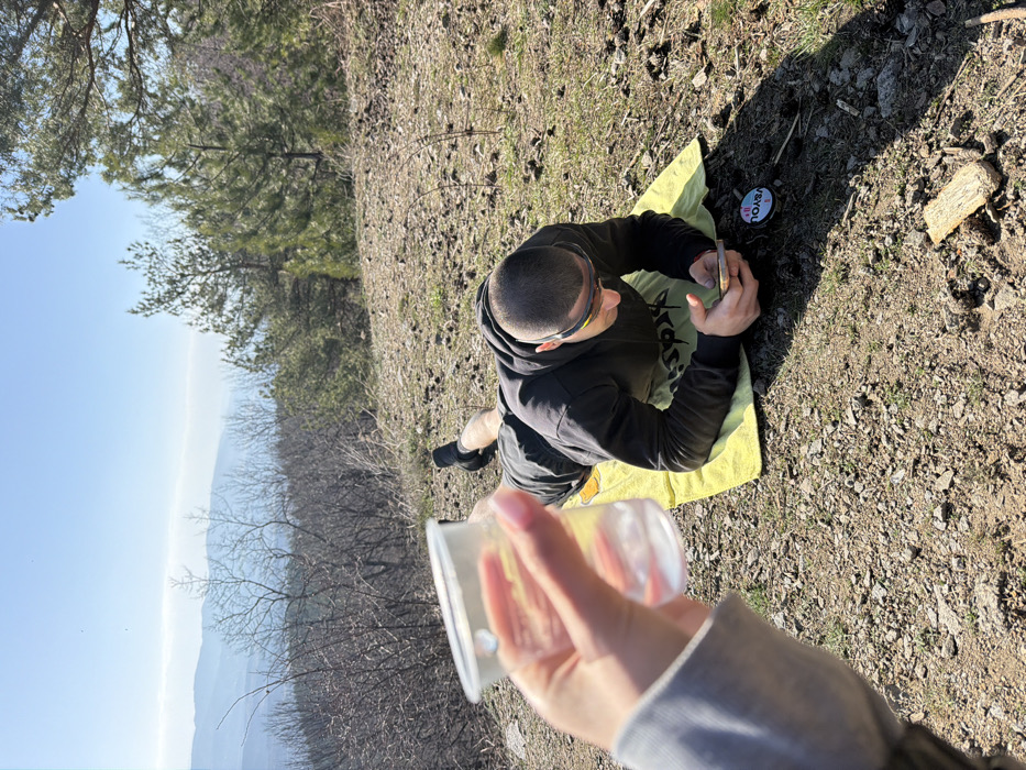 The image depicts an outdoor scene in the city of Kladnitsa, Bulgaria, under a clear blue sky. In the immediate foreground, a person's hand, partially visible on the left, holds a clear plastic cup containing a light-colored liquid and ice cubes. The ground is composed of dry, rocky dirt with sparse vegetation. A male individual is positioned centrally in the midground, lying prone on a yellow towel. He wears a dark hooded sweatshirt, dark shorts, and dark athletic shoes, with dark wraparound sports sunglasses obscuring his eyes. He is engaged with a smartphone, holding it with both hands. To his right, a small black circular container marked "VSBYOU" is visible, alongside a piece of split wood. The background reveals a mountainous or hilly terrain covered with a mix of bare deciduous trees and green evergreen pines, extending towards distant hazy peaks.