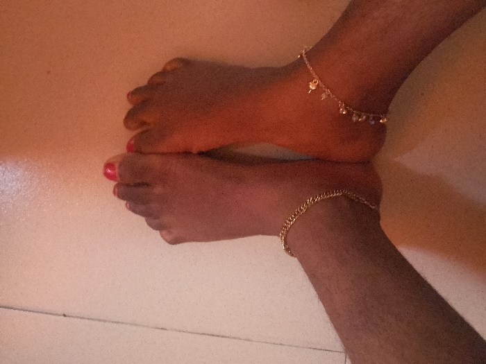 The image displays two bare human feet, positioned side-by-side with toes pointing towards the top of the frame, resting on a light-colored tiled floor. The specific city of Ado, Nigeria, as requested, cannot be visually confirmed from the image content. Both feet exhibit a dark skin tone, and all visible toenails are painted with red nail polish. The left ankle is adorned with a gold-colored, curb-link chain anklet. The right ankle features a finer gold-colored chain anklet embellished with multiple small, multi-colored charms. The floor appears to be ceramic or similar material, off-white or light beige, with a faint grout line visible on the left side. Lighting suggests an indoor environment, casting minimal shadows directly beneath the feet.