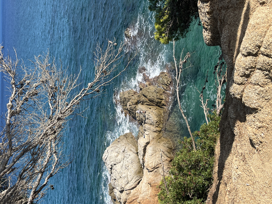 This image depicts a coastal scene in Lloret de Mar, Spain, viewed from an elevated vantage point. In the immediate foreground, a sandy, rocky path or cliff edge is visible, casting prominent shadows from overhead branches. Below this path, dense green foliage, possibly containing small red berries, grows along the incline. The midground features a rugged coastline with multiple rocky outcrops extending into the clear, blue-green Mediterranean Sea. White seafoam indicates wave action against these formations. On a central, lighter-colored rocky outcrop, a lone individual is observed. This person is wearing a light-colored top and dark trousers or shorts, standing facing the open water, and appears to be engaged in fishing, holding a long, slender rod extending towards the sea. The water surrounding these rocks exhibits high clarity, allowing the seabed to be partially visible. The background consists of the expansive, deep blue open sea, meeting the horizon under a clear sky. Dominating the upper portion of the image is a network of bare, gnarled tree branches, likely from a pine species, sparsely adorned with cones. These branches extend across the frame, partially obscuring the distant sea, though some green pine needles are visible on a lower branch towards the right.