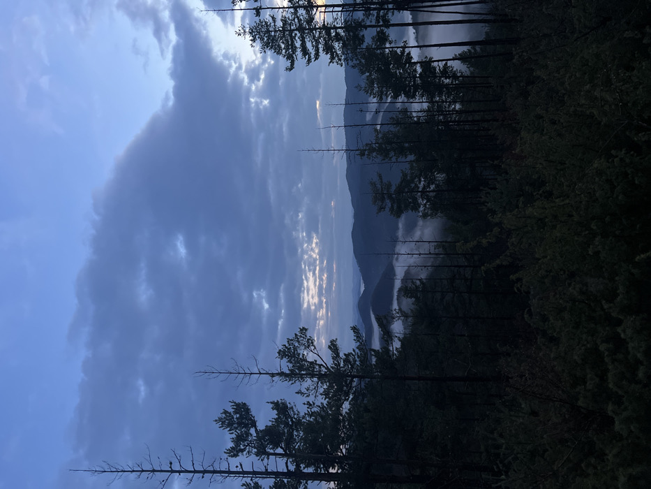 The image depicts a vast, forested mountainous landscape near Gradat, Bulgaria, observed under low-light conditions, consistent with dawn or dusk. The foreground and midground are densely populated with dark evergreen trees, primarily pines, some appearing tall and slender, while others are partially defoliated or dead with prominent bare trunks. A thick, low-lying mist or fog occupies the valleys and lower elevations between multiple layers of mountains that recede into the hazy distance. The sky above is predominantly overcast with deep blue and grey stratocumulus clouds, revealing faint lighter hues along the horizon, suggesting an obscured sunrise or sunset. No human subjects, animals, man-made structures, or active interactions are present in the scene. A body of water, possibly a lake, is faintly visible amidst the distant mountains on the left side of the frame.