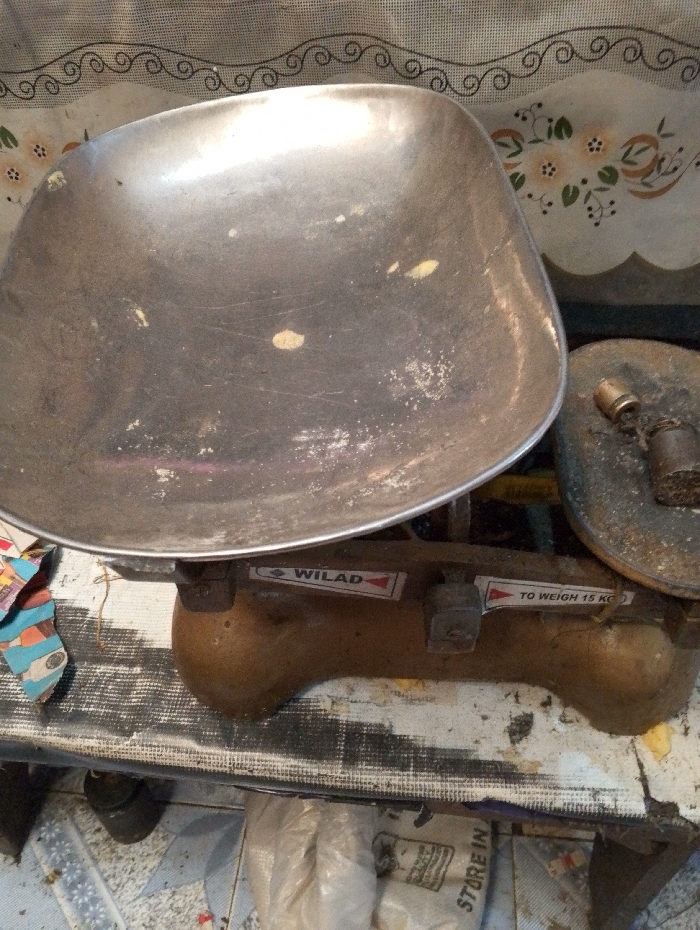 The scene, situated in Kinale ward, Kenya, depicts a top-down view of a used two-pan balance scale
