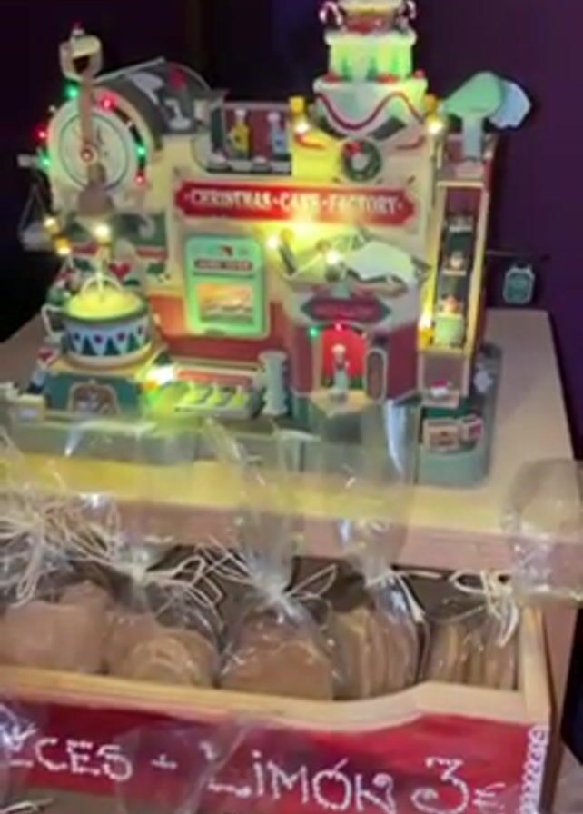 A Christmas-themed display features a Lemax animated miniature village called “Christmas Cake Factory”. The village is on a wooden table with a red sign that says "Nueces y Limon, 3 Euros". Packages of cookies are displayed in a wooden tray in front of the village. The village is lit up with small, colorful lights, and various parts of it move. The village has multiple sections, including a section that looks like a bakery, a cake-decorating station, and a tower with a rotating cake on top. The background is a dark, possibly purple, wall.