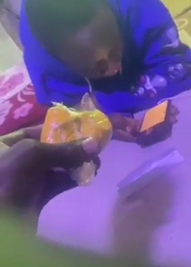 close-up of a hand holding a wrapped, yellow object, possibly food. A man wearing a blue hoodie is sitting on a bed behind the hand, looking at a phone or device. There is white paper on the bed. The scene is lit with a slightly purplish tone. The man seems to be interacting with the person holding the object.