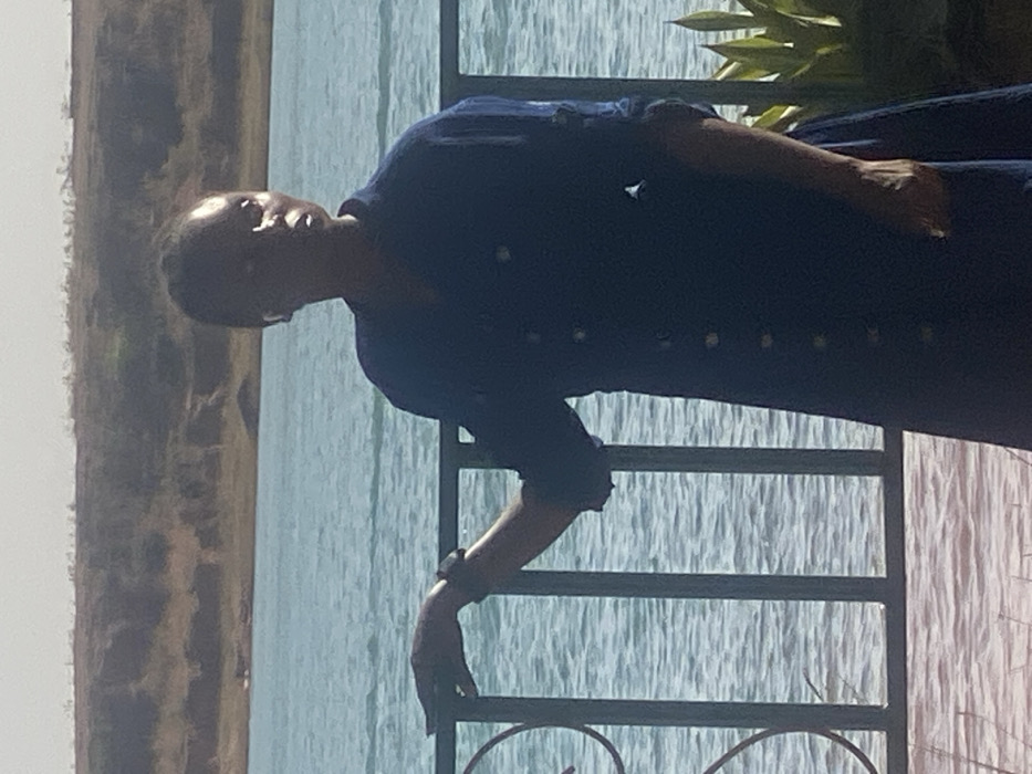 The image displays an adult female standing outdoors, positioned behind a dark metal railing. She wears a dark blue, long-sleeved shirt-dress with multiple light-colored buttons down the front; the sleeves are rolled up. A dark wristband or watch is present on her left wrist, and a light-colored earbud is visible in her right ear. Her right hand rests on the top rail of the railing. She stands on a reddish-brown tiled or paved surface. Directly behind the railing is a large body of light blue-green water, showing ripples on its surface. Across the water, in the background, undulating brown terrain with sparse vegetation is visible under a clear, light blue sky. Green foliage is also visible to the right of the railing. The scene is consistent with the waterfront area of Lamingo Dam in Jos, Plateau State, Nigeria.