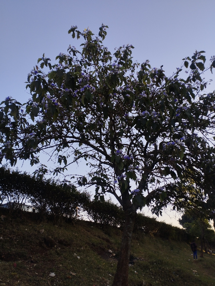 A tree with purple and white flowers dominates the scene, its branches reaching towards a light blue sky. Below the tree, a grassy slope leads to a dense hedge. Further in the background, a line of trees extends into the distance where a person in blue clothing is visible. The lighting suggests either dawn or dusk, casting a soft glow over the landscape.