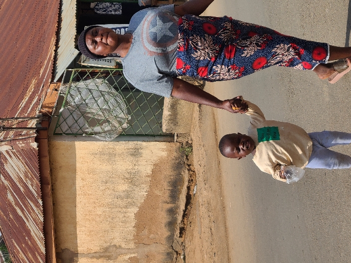 Two individuals, an adult female and a young child, are depicted walking rightward on a paved road in a city of Unknown, Unknown. The adult female, with dark skin and wearing a dark knit beanie, a grey t-shirt with a Captain America shield logo, a dark blue and red patterned skirt, and light brown slip-on sandals, holds the child's left hand with her right hand. The child, also with dark skin and wearing a light beige long-sleeved shirt with "You will be fine" text and light grey pants, carries a clear plastic bag in their right hand. In the background, a single-story building with light-colored, weathered walls and a heavily rusted corrugated metal roof is visible. A dark green metal security gate or screen covers an opening in the building. The area behind the figures and to the left of the building appears to be unpaved dirt. The scene is illuminated by natural daylight.