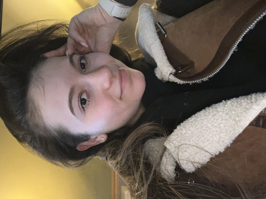 The image depicts a close-up, waist-up shot of a single individual, a young female, facing the viewer. Her skin tone is light, and she has dark brown hair, dark eyebrows, and brown eyes. She is wearing a small, silver-colored stud earring in her visible left earlobe. Her left hand is raised, with fingers gently touching the side of her head/temple area. A white watch with a rectangular face is visible on her left wrist. She is dressed in a black long-sleeved garment, likely a shirt or hoodie, beneath a brown, suede-like jacket or vest featuring a cream-colored sherpa or fleece lining along the collar and lapels. A silver zipper is present on the front opening of the brown garment. Her lips are closed, forming a slight, upward curve, indicating a subtle smile. The background is a plain, solid warm yellow wall. There are no discernible landmarks or contextual clues within the image to specify a precise location within the city of Targovishte, Bulgaria; the scene appears to be indoors.
