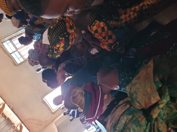 The image captures an indoor gathering of approximately 15-20 individuals within a large room in Rinze, Nigeria