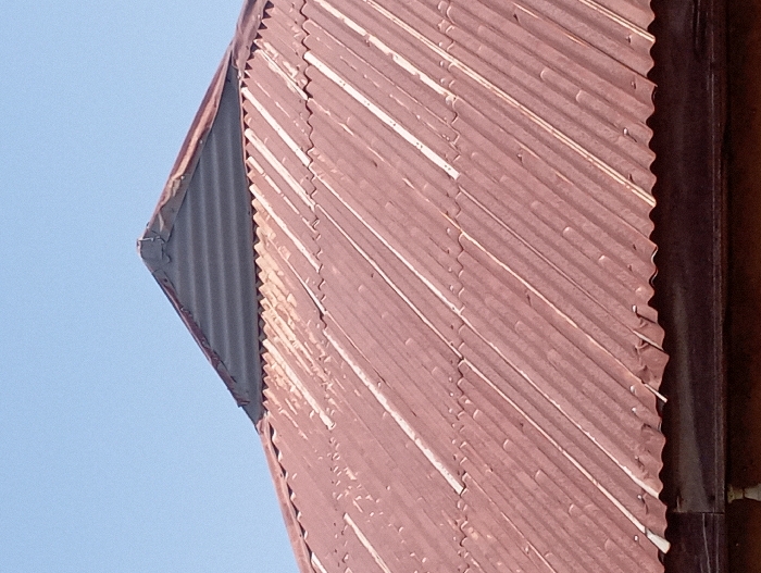 - "A weathered reddish-brown corrugated metal roof is depicted against a clear blue sky in Rido, Nigeria" by FM-5eXOy2, licensed under CC BY 4.0