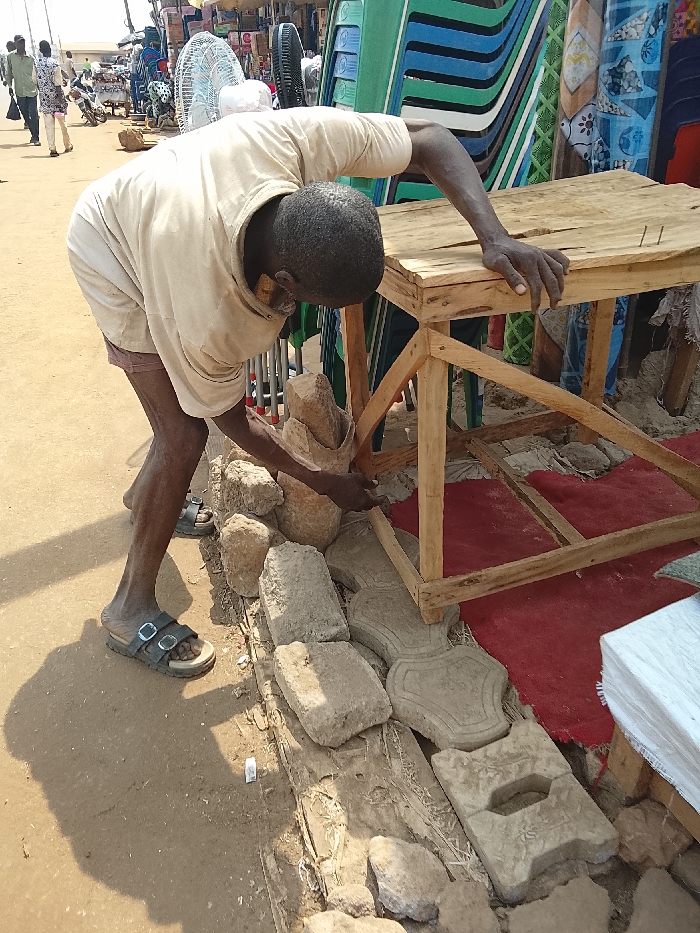 The image captures an outdoor scene in Akwanga, Nigeria, under bright daylight. An adult male with dark skin and short dark hair, wearing a light-colored, possibly beige, short-sleeved t-shirt, light-colored shorts, and dark sandals with two buckles, is depicted in profile, bent forward. His right hand is positioned near a vertical support of an unfinished wooden table's base, while his left hand rests on the table's unfinished wooden top, from which two nails protrude. On the ground between the man and the table, a line of irregularly shaped rocks and light-colored interlocking concrete pavers is arranged. The ground transitions from a dirt path on the left, where a prominent shadow of a person is cast, to a reddish mat or fabric under the wooden table on the right. In the background, an open-air market environment is visible, featuring stacks of green and blue plastic chairs, a white standing fan, patterned fabrics, and various indistinct market stalls. Several individuals are walking in the distant background on the dirt path, and a motorcycle is partially visible. The sky above is bright and clear.