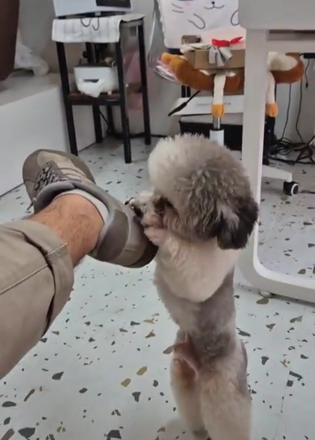 A man's foot, wearing a tan hiking shoe, is being nuzzled by a small dog. The dog is standing on its hind legs, with its front paws resting on the shoe. The dog is primarily white with gray fur on its head and along its spine. The man is wearing tan pants. The setting appears to be an indoor space with a patterned tile floor. A microwave and a white stand are visible in the background, along with a chair with a cartoon cat cushion. The camera remains static, focusing primarily on the dog's interaction with the shoe.