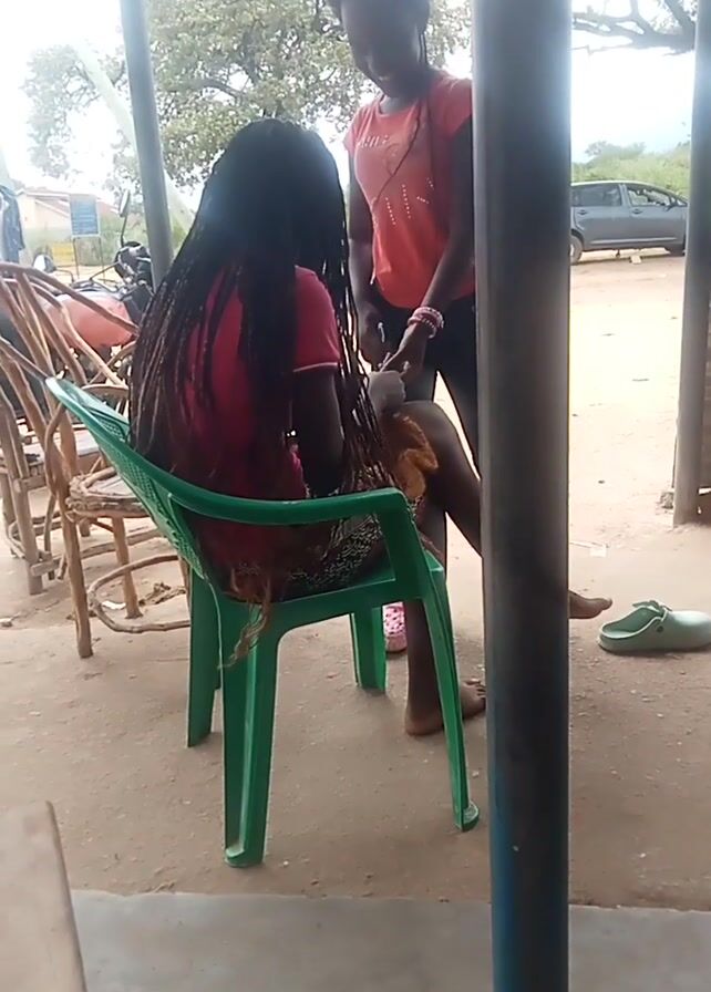 Two people are present outdoors. One individual with long, dark hair sits in a green plastic chair, wearing a red shirt. The other person, also wearing a red shirt, stands behind the seated individual, seemingly working on their hair. The environment appears to be a shaded area with a concrete floor. A metal pole is visible in the foreground, partially obscuring the view. Additional objects like a motorcycle, a shoe, and other chairs can be seen in the background.