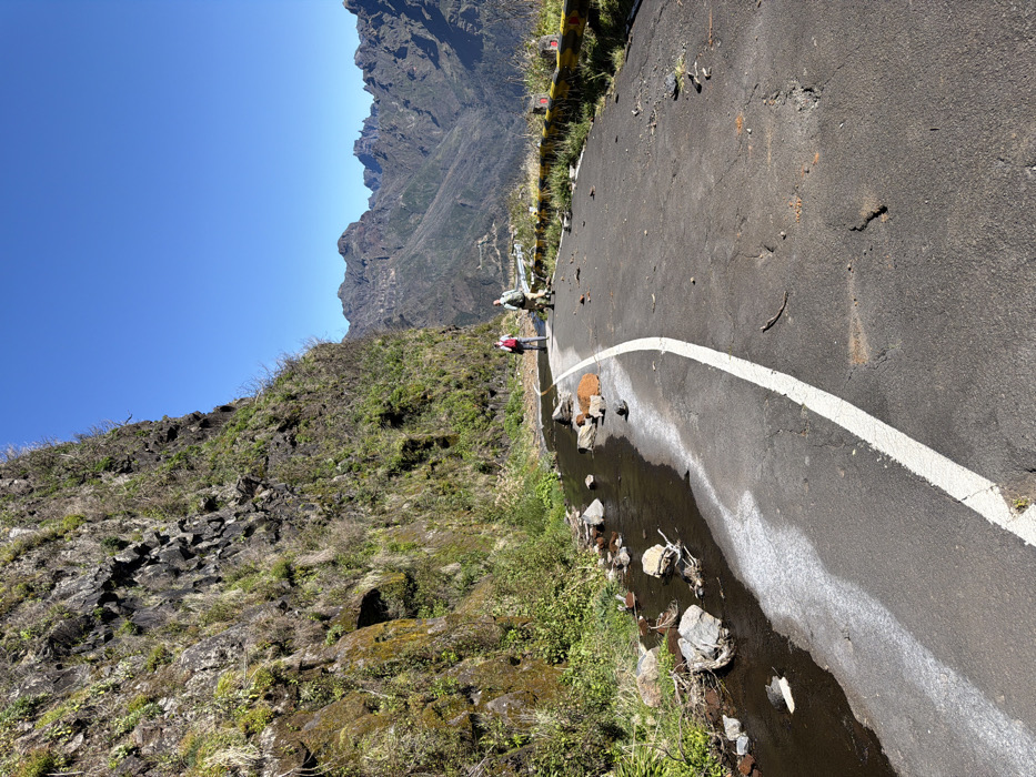A paved road curves along a mountainside with a steep, rocky slope on one side and a guardrail on the other. A single white line marks the road's edge. Rocks and debris are scattered on the road surface, especially near the guardrail. A few figures are visible near the guardrail. In the distance, a towering mountain range rises against a clear blue sky. Vegetation clings to the slope, adding patches of green.
