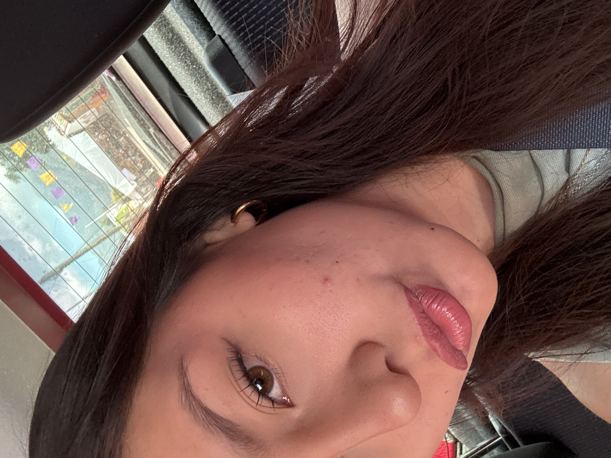A close-up, slightly angled shot shows a woman in the passenger seat of a vehicle. She has light skin, brown eyes, brown hair, and is wearing a gold earring. She has a mole on her forehead. The vehicle is moving, as suggested by the blurred background. Through the car window, a glimpse of buildings and colorful banners indicates the presence of a city. The location is inferred to be San Andrés Huayapam, Mexico, based on the colorful banners typically seen in Mexican towns. The woman is wearing a seatbelt. Her lips are glossy.