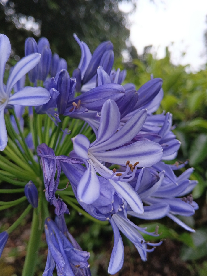 A close-up, eye-level photograph depicts a dense cluster of Agapanthus flowers, also known as Lily of the Nile, in a garden setting in the city of Unknown, Vietnam. The prominent subjects are numerous individual flowers and buds, predominantly in shades of light to medium purple with distinct darker purple vertical stripes on their petals. Several flowers are fully open, revealing multiple white and purple striped petals and extending stamens tipped with visible brown anthers. Other flowers are partially open, and some at the lower left appear to be in a state of wilting or decline, exhibiting shriveled, darker purple petals. The flowers are supported by slender, vibrant green stalks radiating from a central point. The background is rendered with a shallow depth of field, appearing as a soft-focus blur of green foliage at the lower right and top left, with a brighter, indistinct area, likely sky, visible at the upper right. The environment is outdoors, characterized by natural light. No people or human artifacts are visible.
