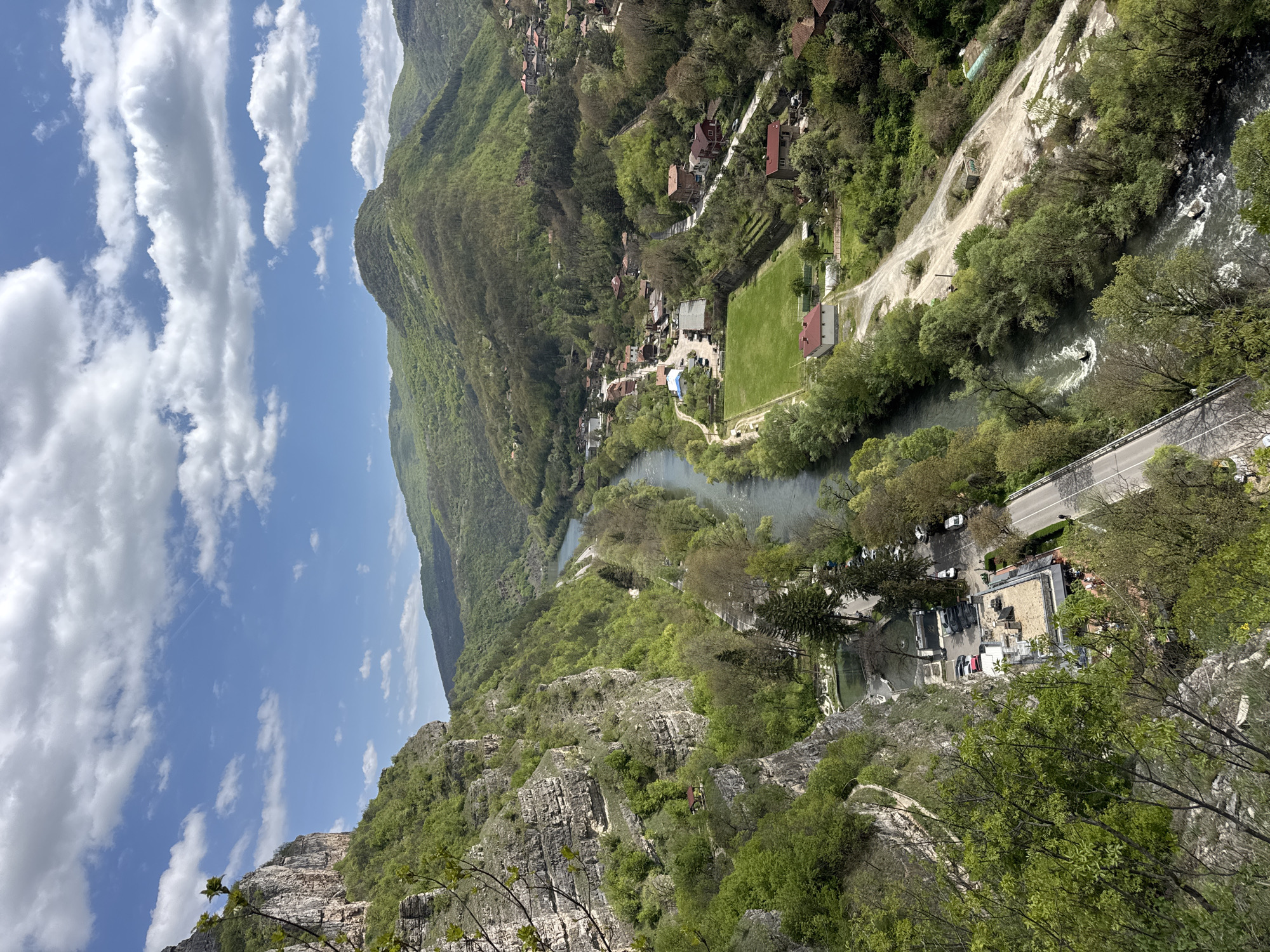 The image presents a high-angle view of the terrain in the city of Milanovo, Bulgaria. A river winds through a valley with lush green vegetation. A road runs alongside the river with parked cars. There is a building with an outside patio sitting on a cliff. On the other side of the river is a green sports field with houses dotting the landscape. A mountain rises up on the left, covered in trees. The sky is blue with puffy clouds. The image is taken from a high vantage point, possibly a cliff edge or mountain. The camera angle appears slightly tilted.